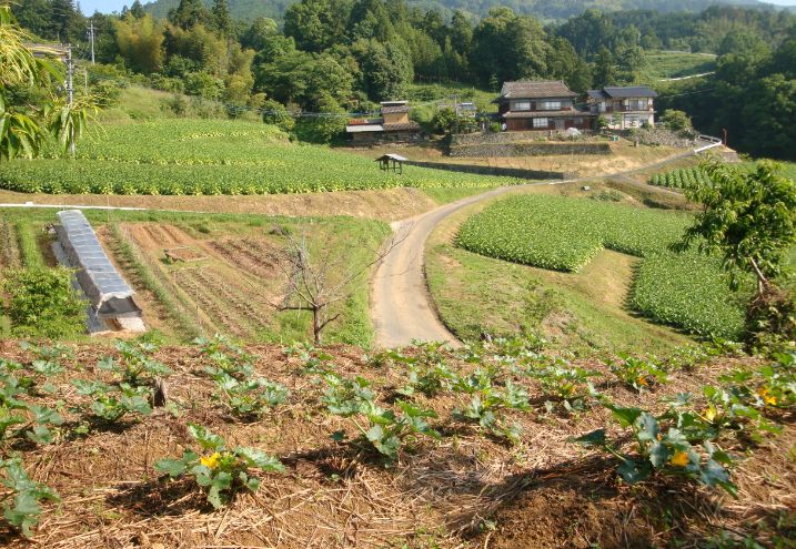 季節が合えば、ほっといても育つ。 それは解っているのですが、 それでは商売になりません。 農業ではありません。 ズッキーニ。 放置されていた斜面の 朽ちた栗の木を少し切って起こし ズッキーニを植えました。 ここからの眺めが、けっこう好きです。 入梅前のほんの少し、畑にいるのが一番楽しい季節です・・・